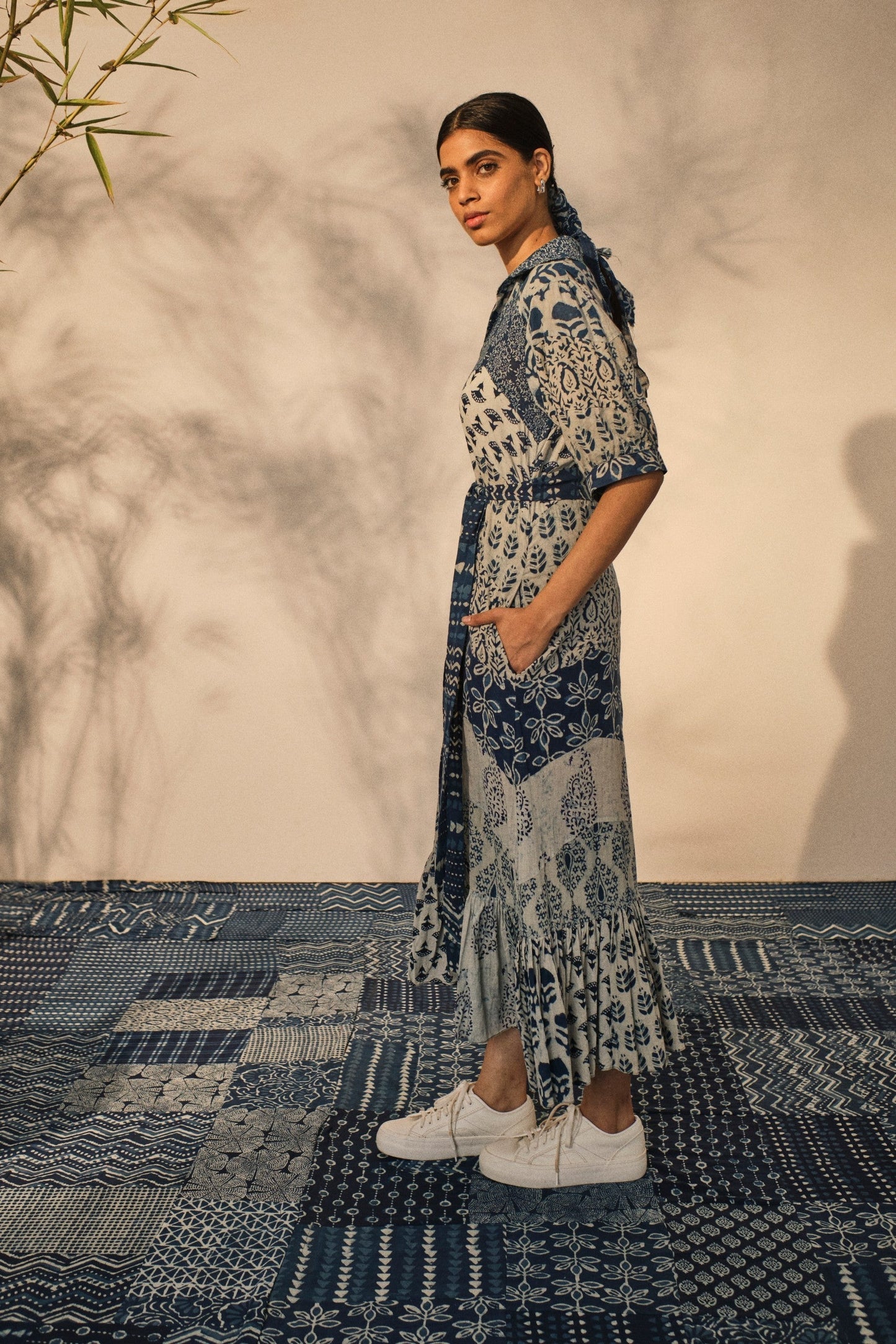 This collared dress is a delightful showcase of patchwork elegance, featuring hemline gathers that add a touch of flowy charm. With half sleeves and a defining belt, it offers a flattering silhouette. The inclusion of pockets on either side combines convenience.