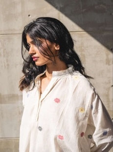 Floral Pattern Off White Top at Kamakhyaa by Araayeh. This item is Artisan Made, Floral Patterns, Handwoven Cotton Jamdani, Off White, Relaxed Fit, Tunic Tops, Work Wear