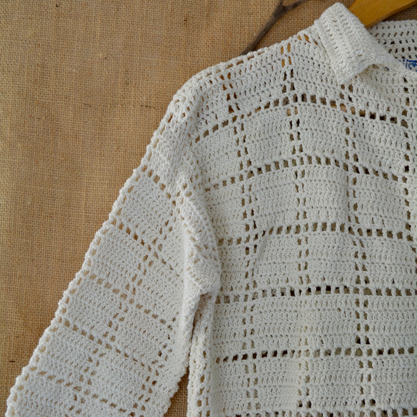 Ivory Grid Crochet Shirt at Kamakhyaa by Ikriit'm. This item is Bloom by Ikriit'm, Casual Wear, Cotton, Crochet, Crochet Apparel, Relaxed Fit, Under $100, White, Womenswear