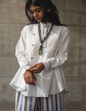 White Work Wear Handwoven Tunic Top at Kamakhyaa by Araayeh. This item is Artisan Made, Handwoven Cotton Material, Polka Dots, Relaxed Fit, Tunic Tops, White, Work Wear