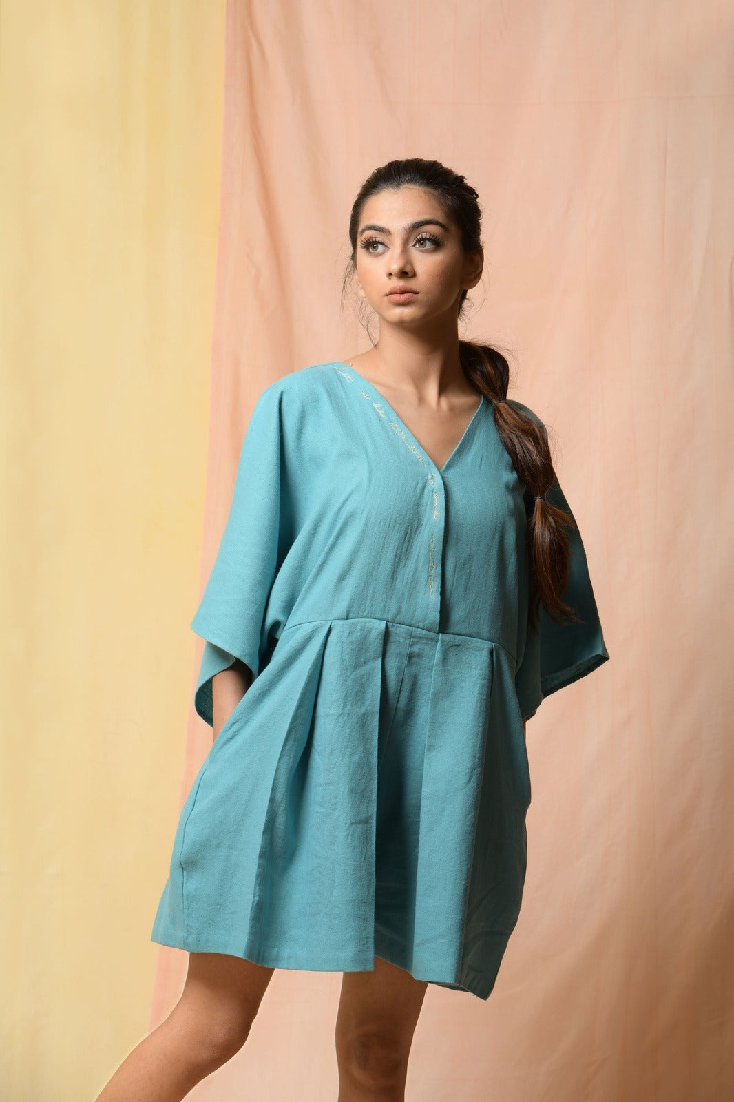 This jumpsuit in teal blue shade symbolizes the true grit that our women have shown in the face of adversity. Along with that there are: - Pleats for easy hip movement. - Kimono sleeve. - Side seam pocket. - Let us be kinder to one another embroidery on the front neck.