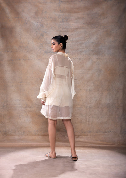 Loose Fit Organza Shirt Set at Kamakhyaa by Akashi Clothing. This item is Brunch Wear, Hand Embroidered, Loose Fit, Modal Satin, Off-white, Organza, Party Wear Co-ord Sets, Resort Wear, Travel Co-ord Sets, Vacation Co-ord Sets, Vacation Wear, White, Womenswear, Zaira by Akashi Clothing