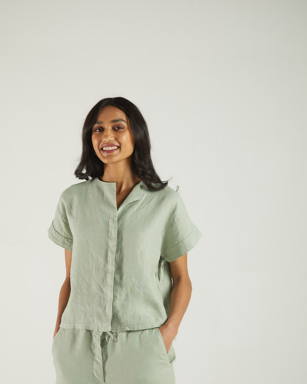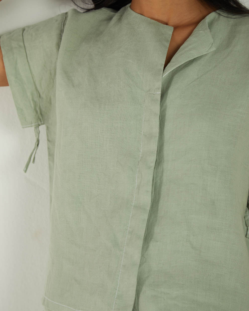 A boxy shirt with cap sleeves that tie up at the bottom, this hemp separate is a great addition to your everyday wardrobe.