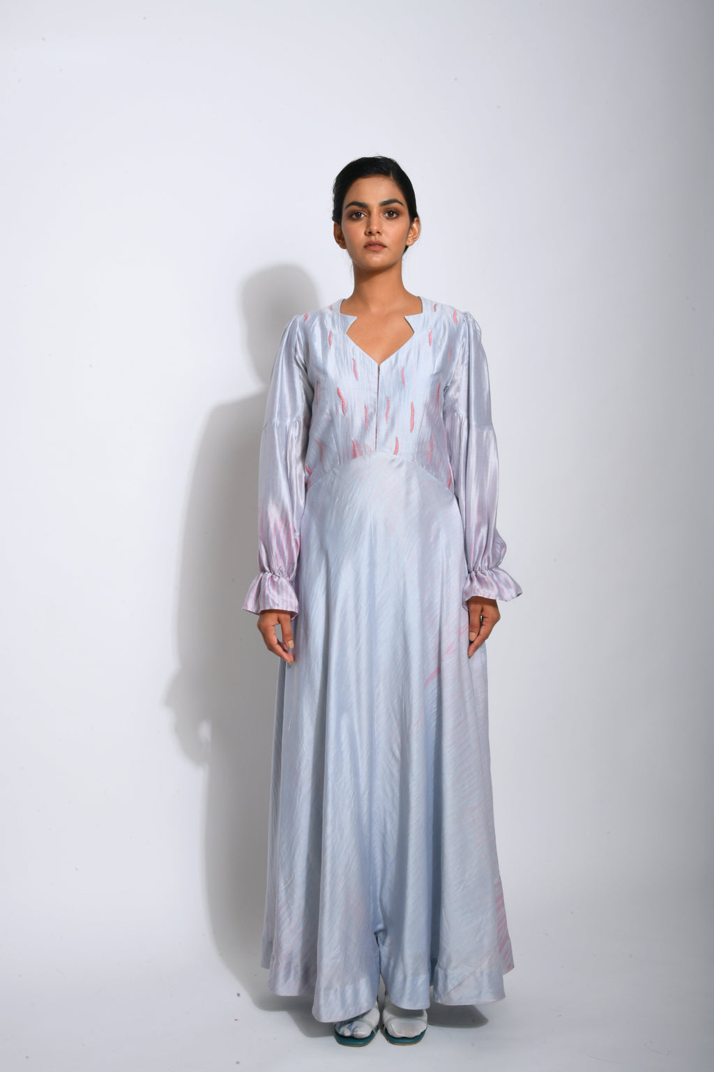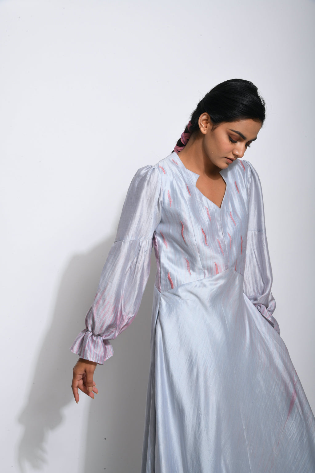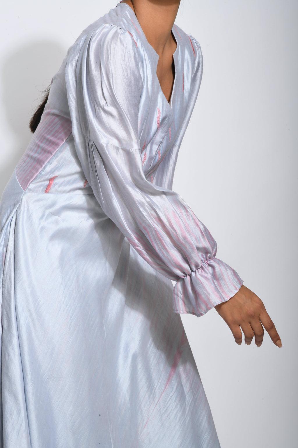 This style is made of handwoven pure silk fabric which was woven by our weavers in Murshidabad. It’s a button down panelled white pearl silk dress with statement neckline & sleeves details. Style it up with our super chic hand died stockings or textured pants to add some drama & a splash of color to the solid style.