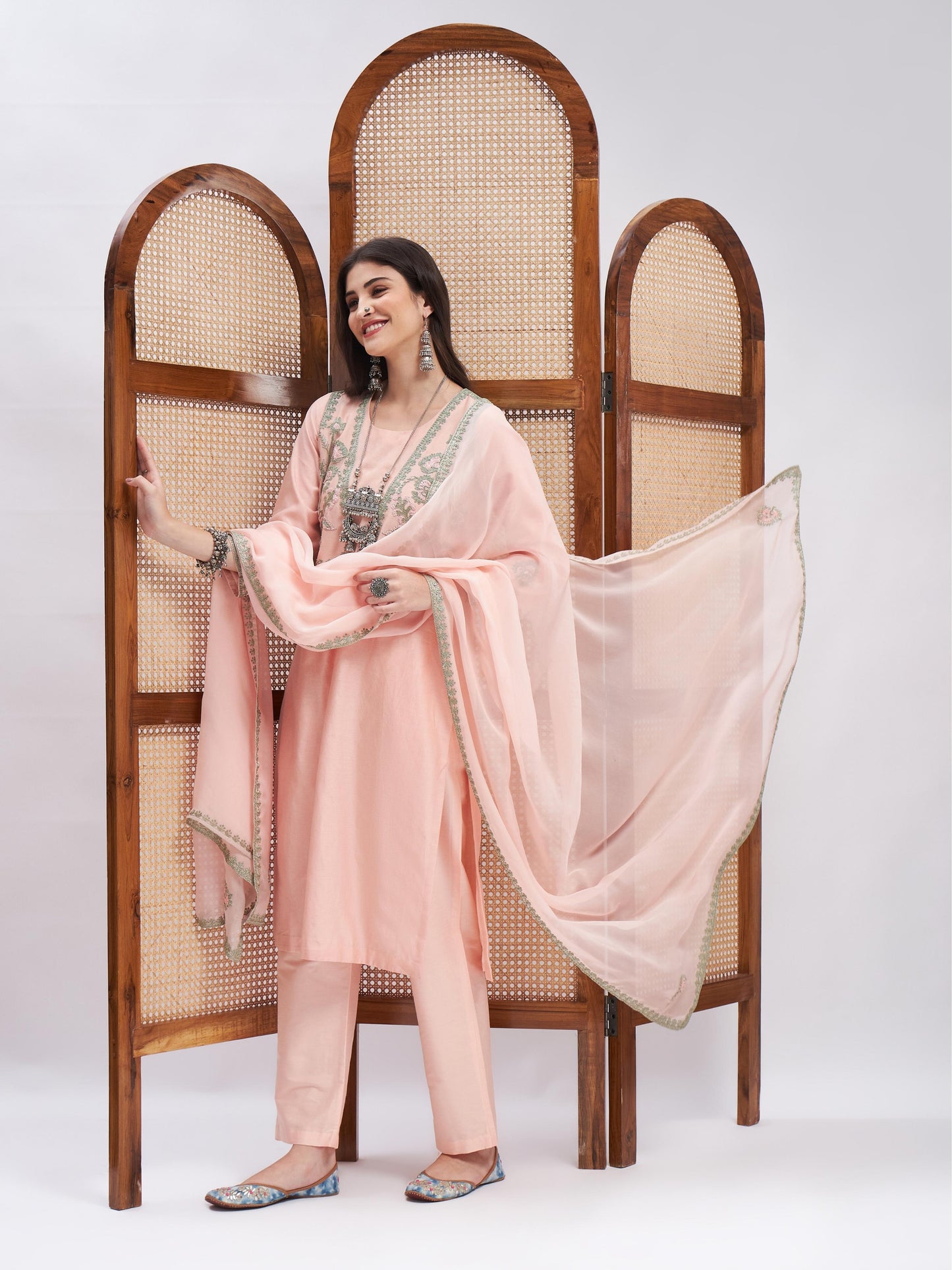 Peach kurta and tonal pants and resham dori embroidered dupatta. Peach silk chanderi kurta set with tonal straight pants. The kurta set comes with fine mulmul lining. The organza dupatta is finely crafted with resham dori work embroidery.