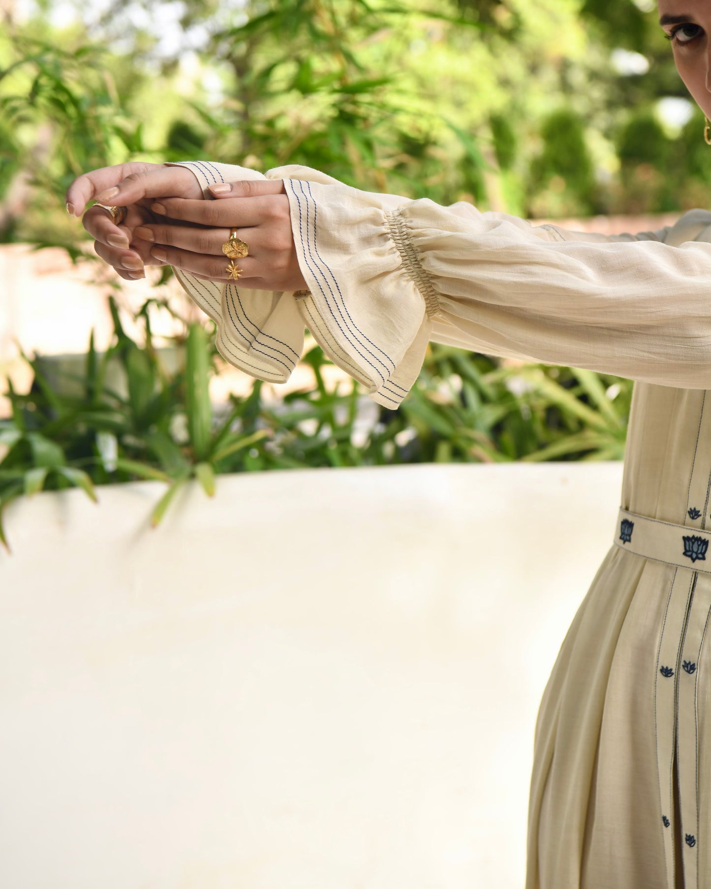 It’s an A-line dress made in hand loomed Banglori siilk fabric that has statement heavily embroidered placket and knife pleats from shoulders to bust. It s V-neckline and statement sleeves adorned with thread details. It comes along with side pockets and hand embroidered flowers patched on detachable belt.