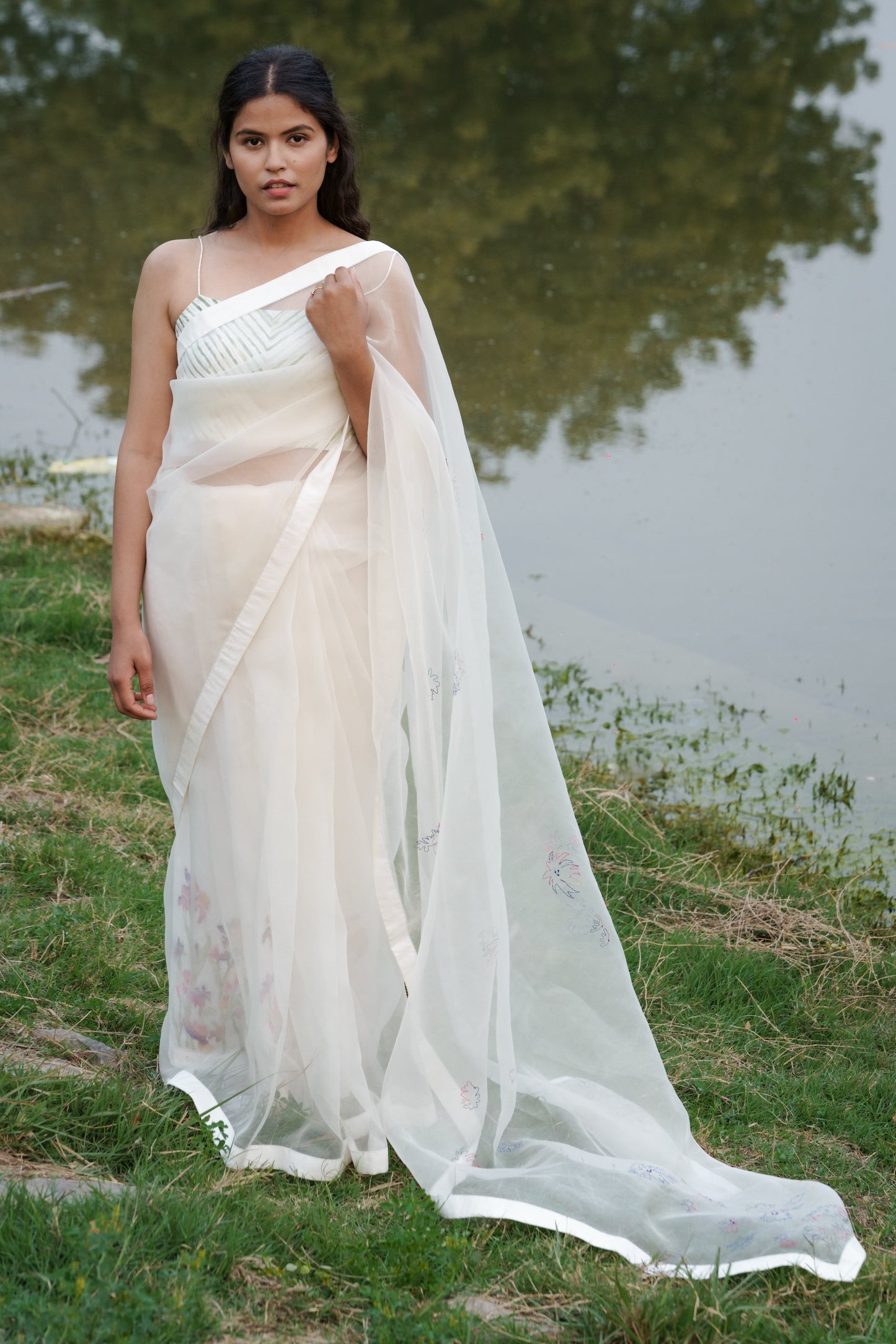 One of the draperies that have stayed static and made its existence a permanent as well as classical. Crafted in 100% silk organza, this saree is a rare beauty and hard to look away from. Perfectly finished with floral hand embroidery and a petticoat with floral hand painting by resist batik, this piece is endearingly mesmerizing. -Silk organza saree with cotton facing -Floral hand embroidery on pallu -Petticoat has floral resist batik with hand painting on all 6 panels.