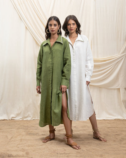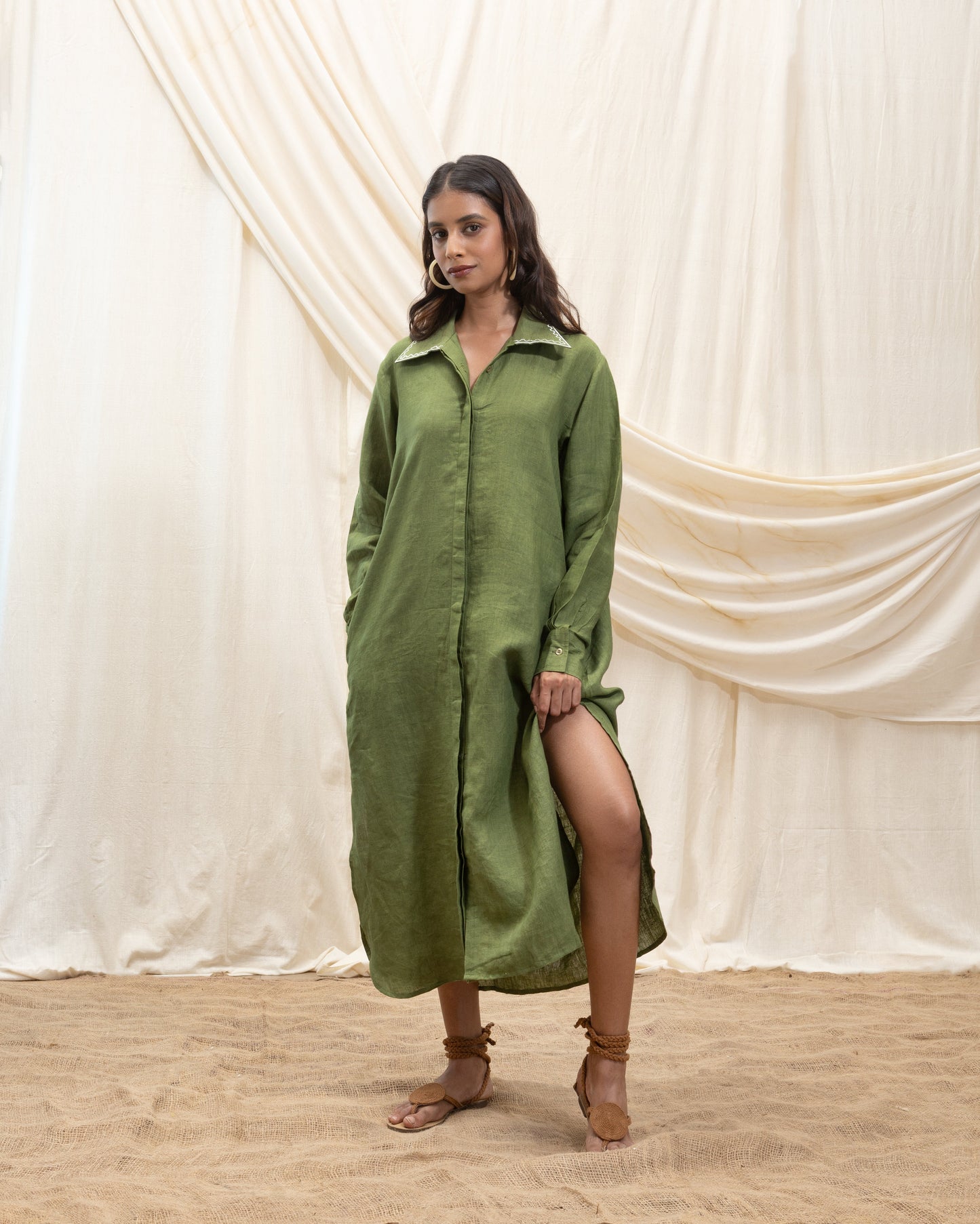 A sophisticated yet effortless full-length shirt dress featuring a bold thigh-high slit for a contemporary edge. Designed with practical pockets on both sides, it blends style with functionality. The collar is accentuated with our signature line embroidery in a contrasting shade, adding a refined detail. At the back, our signature stamp and Akashi logo in Hindi are embroidered in their signature placements. The full sleeves are tailored with a relaxed fit and finished with front cuff button fastenings, enhancing the dress’s cool, laid-back appeal.