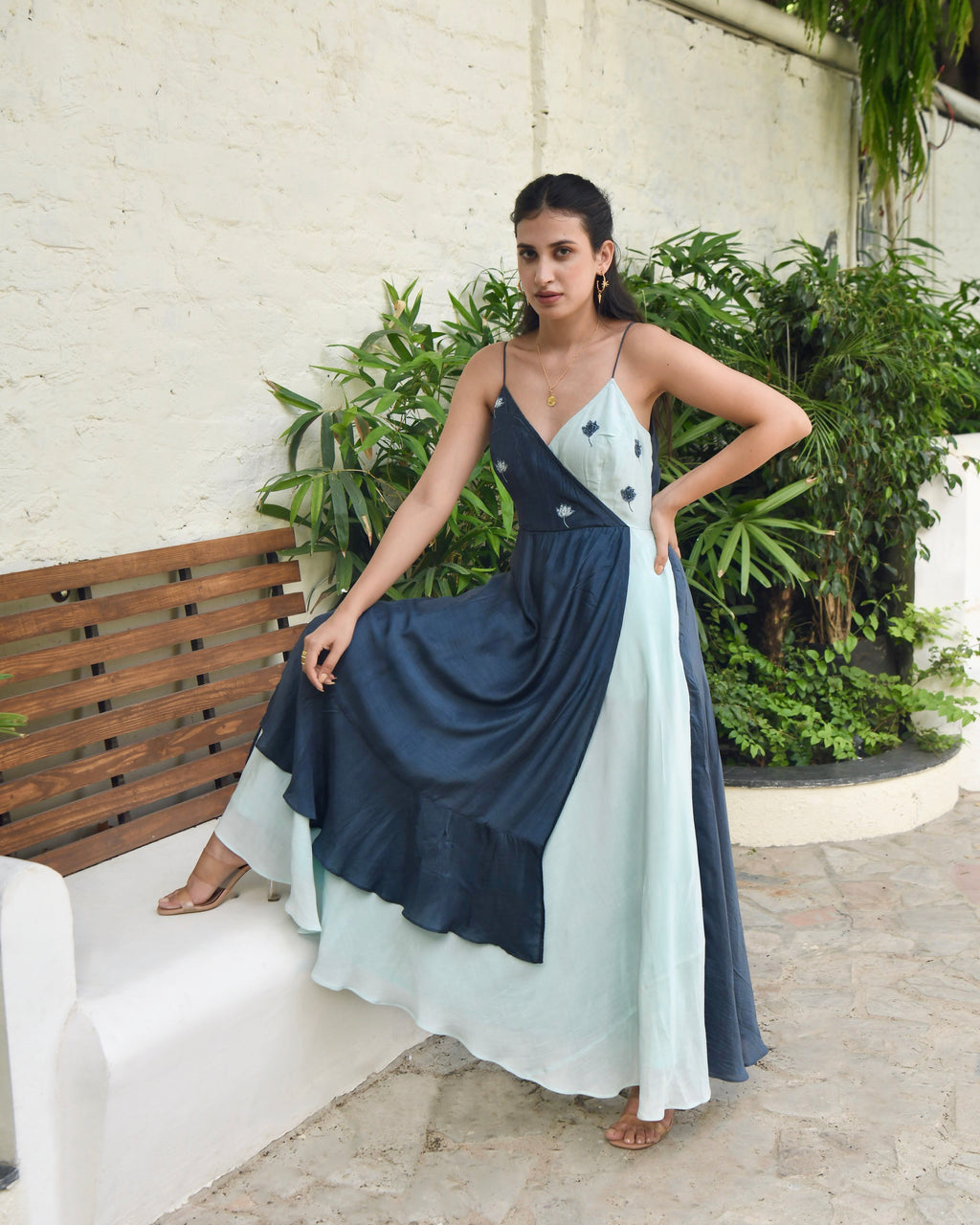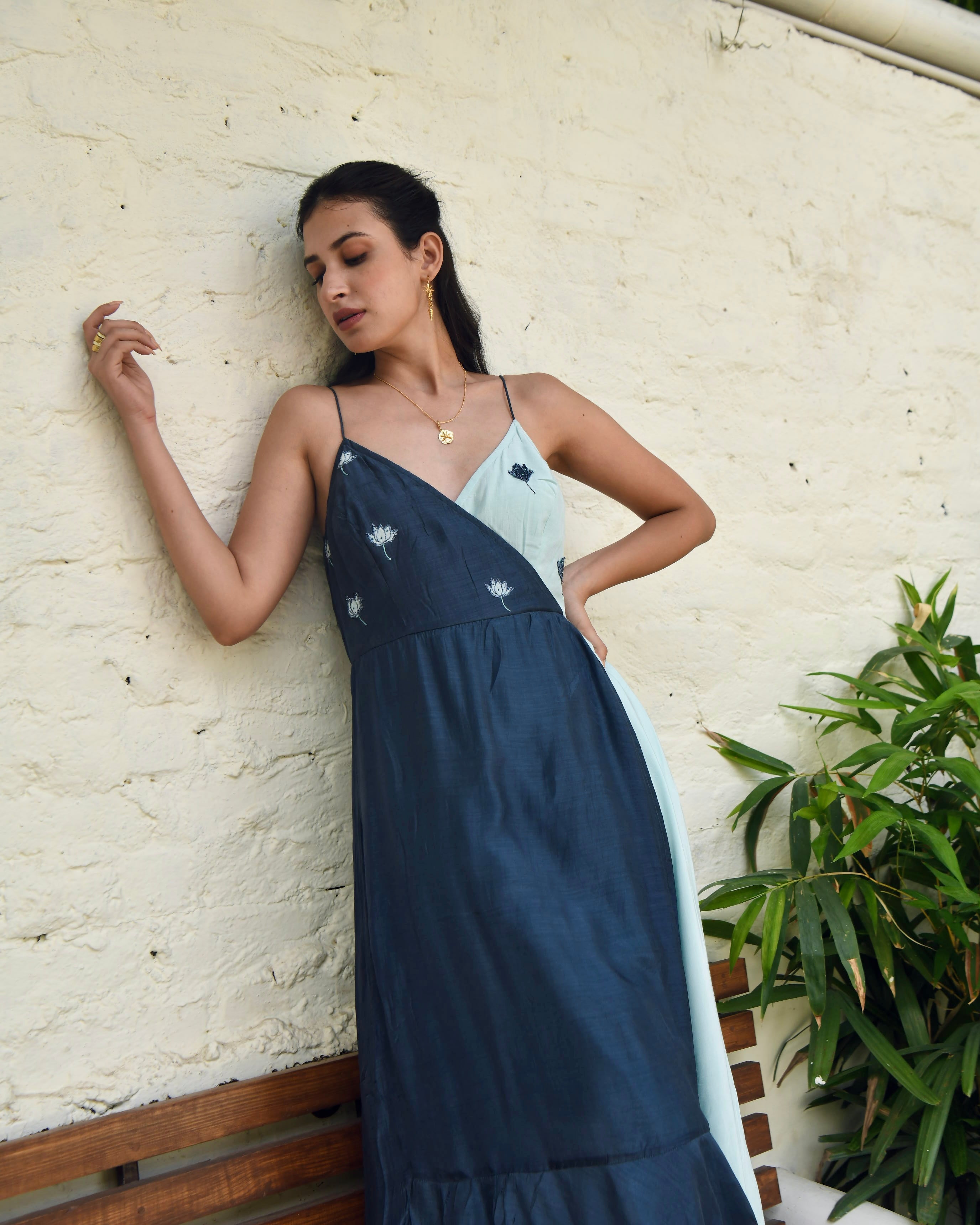 Blue SIlk Embroidered Dress at Kamakhyaa by Taro. This item is Best Selling, Blue, Dusk To Dawn, Embroidered, Evening Wear, FB ADS JUNE, For Daughter, July Sale, July Sale 2023, Maxi Dresses, Modal silk, Natural, Regular Fit, Silk, Sleeveless Dresses, Womenswear