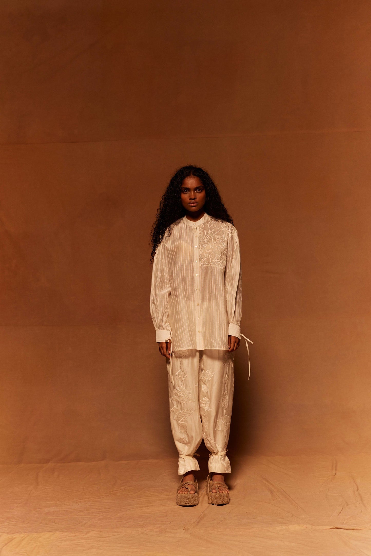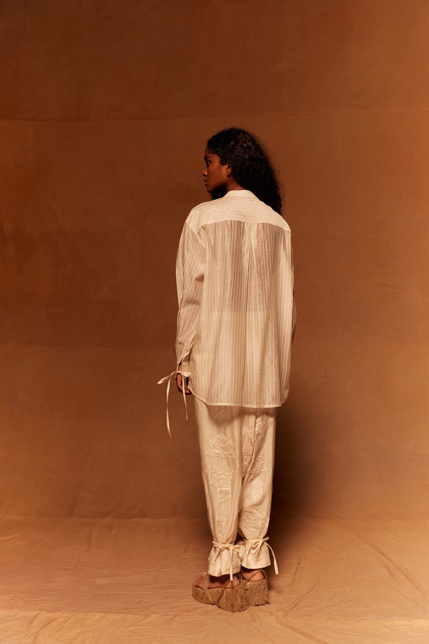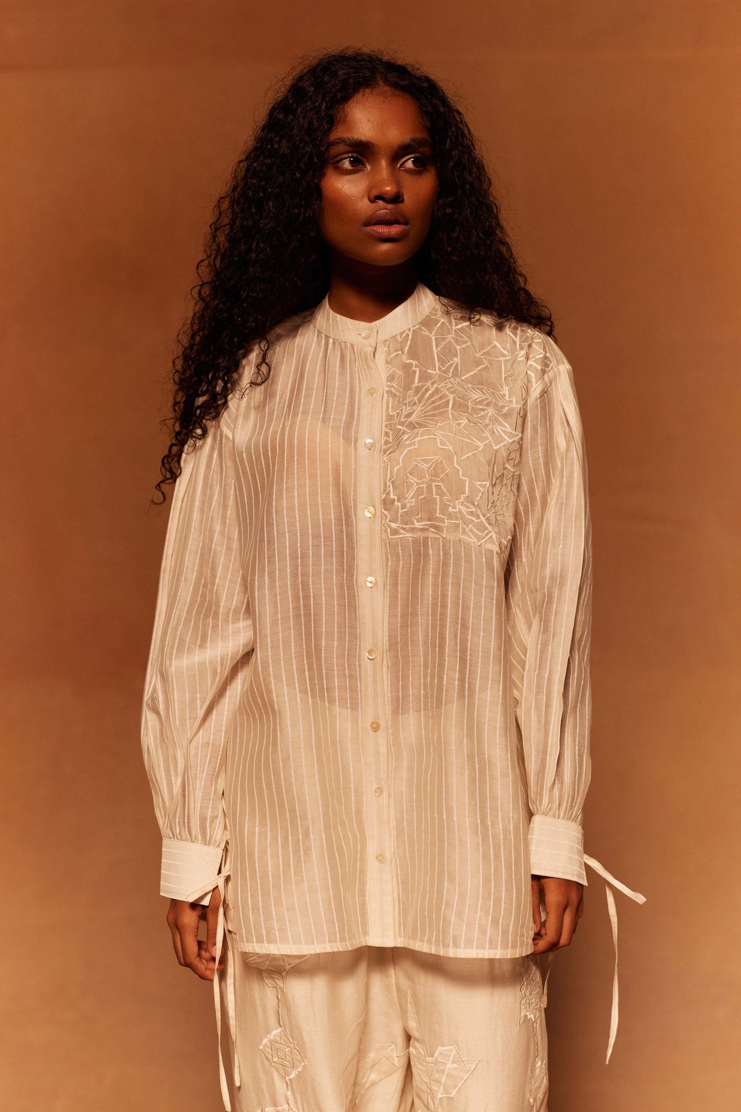 The Dobutsu Mandarin Shirt brings a playful twist to a classic silhouette with its embroidered panels and tie- up cuffs. Crafted from striped Chanderi, this shirt combines a traditional mandarin collar with modern detailing, making it a versatile addition to elevate your everyday wardrobe. Its unique blend of charm and functionality adds an unexpected touch to casual or refined looks alike.