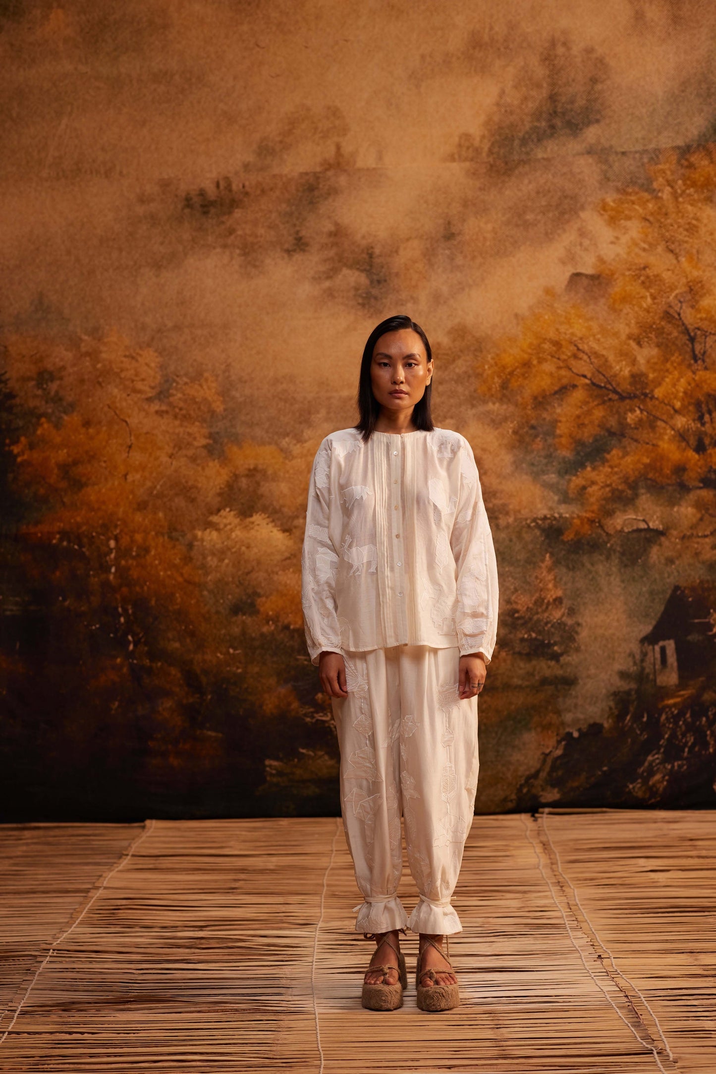 The Kokoro Dolman Shirt showcases intricate appliqué, delicate pleats, and a unique tie-up detail at the back. Designed with a round neckline, its tailored silhouette offers a refined balance of simplicity and sophistication. Versatile enough for any occasion, it