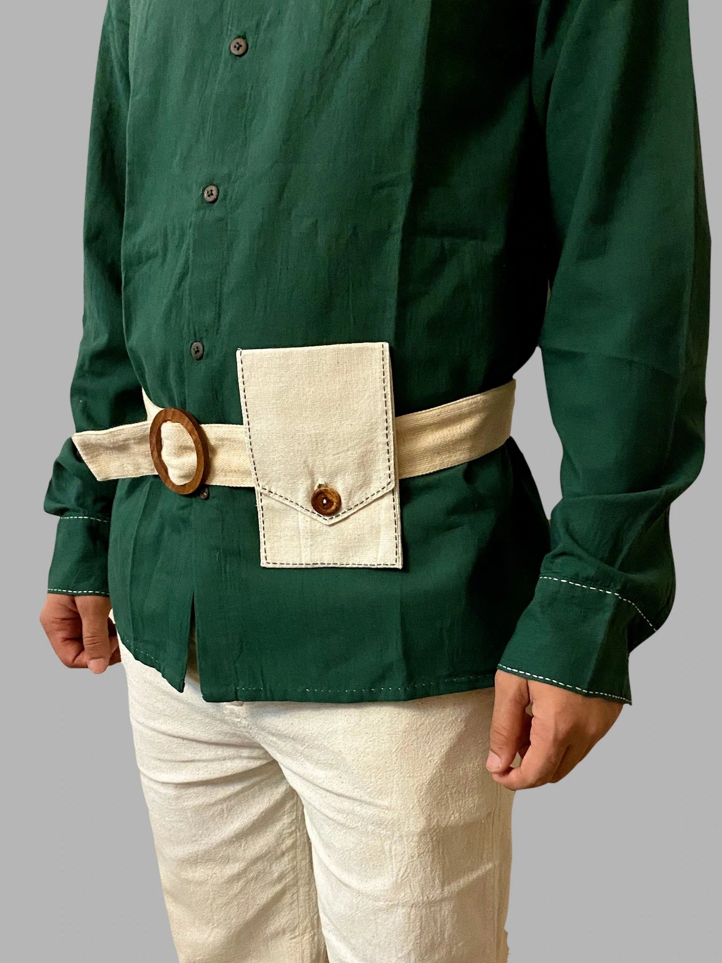 This belt bag is the ideal accessory to take you from work to leisure.This product is created from fabric scraps collected at our workshop. This Messenger bag with a wooden button offers adequate room to accommodate your essentials. It is a hand embroidered accessory that features stitches of Kantha embroidery and comes with two back loops for you to pair it with a belt.