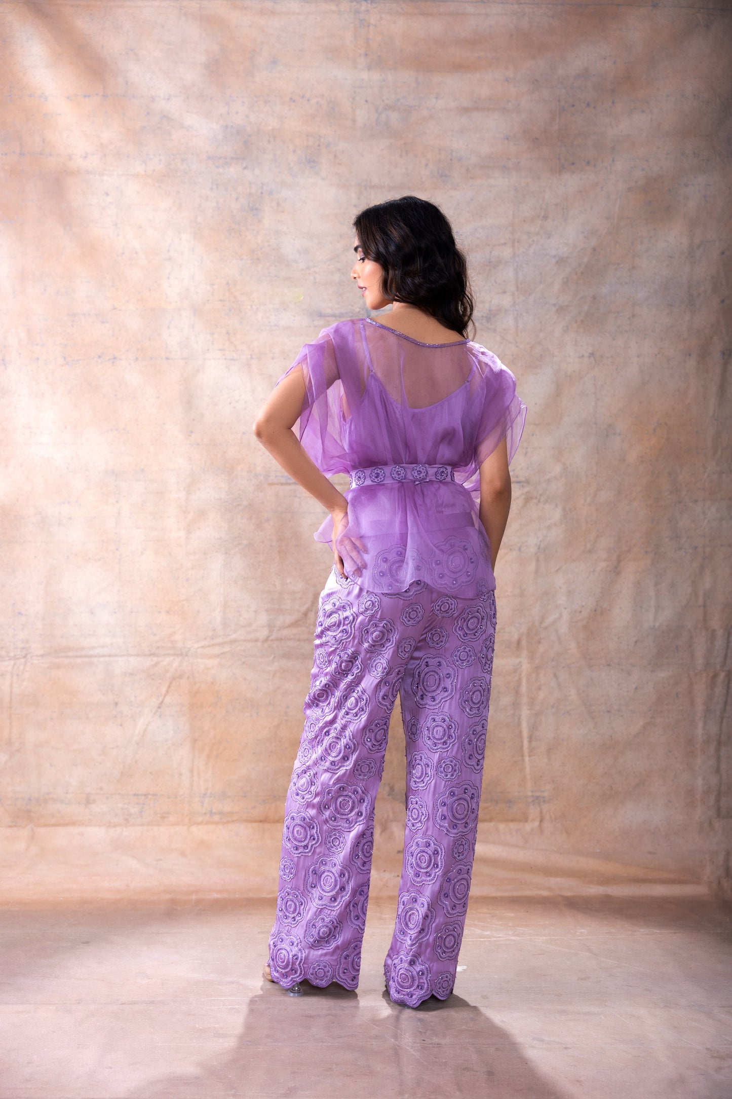 Organza Top with Embroidered Pant Set at Kamakhyaa by Akashi Clothing. This item is Co-ord Sets, Festive Wear, Hand Embroidered, Lavender, missing, Modal Satin, Organza, Party Wear, Party Wear Co-ord Sets, Relaxed Fit, Womenswear, Zaira by Akashi Clothing