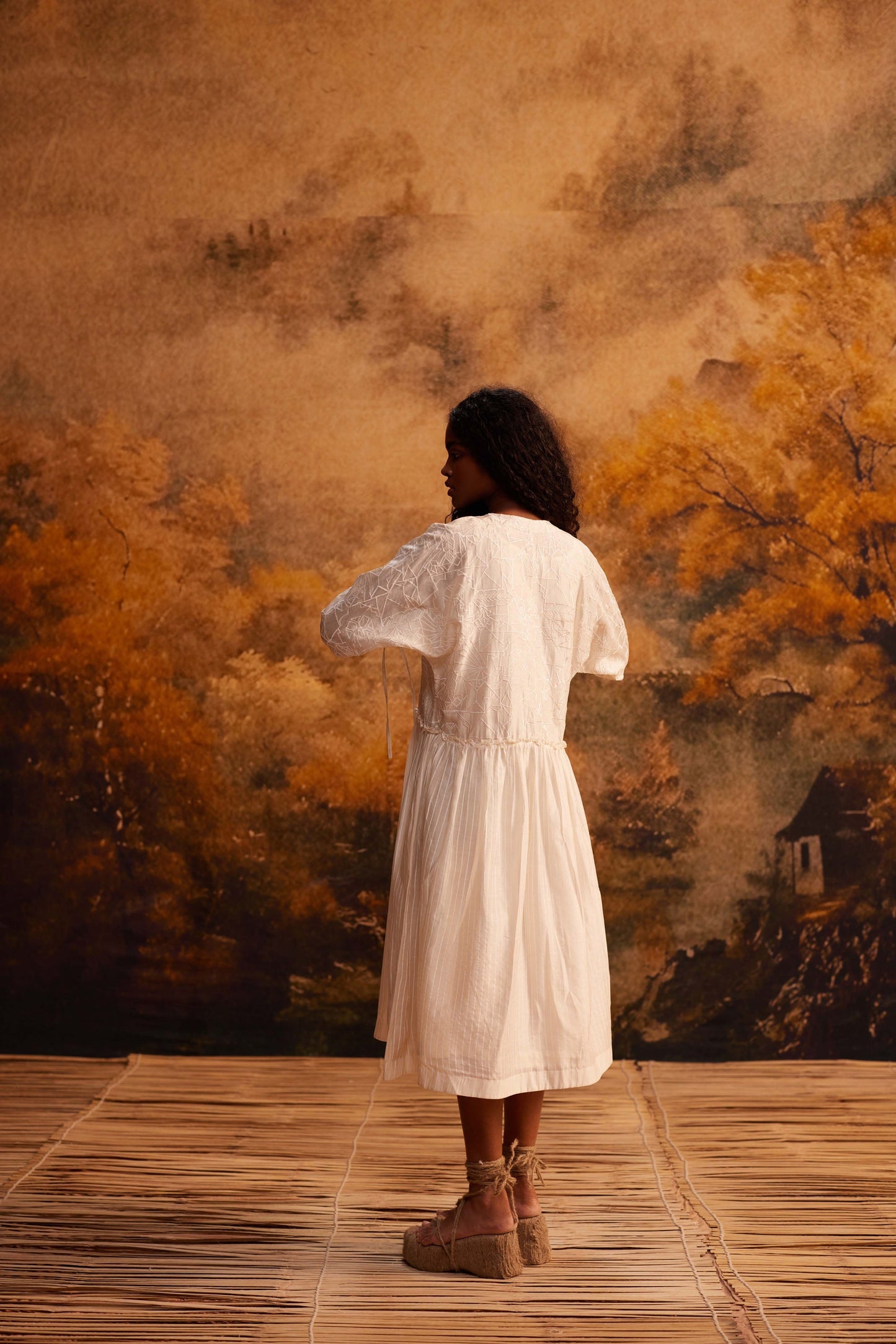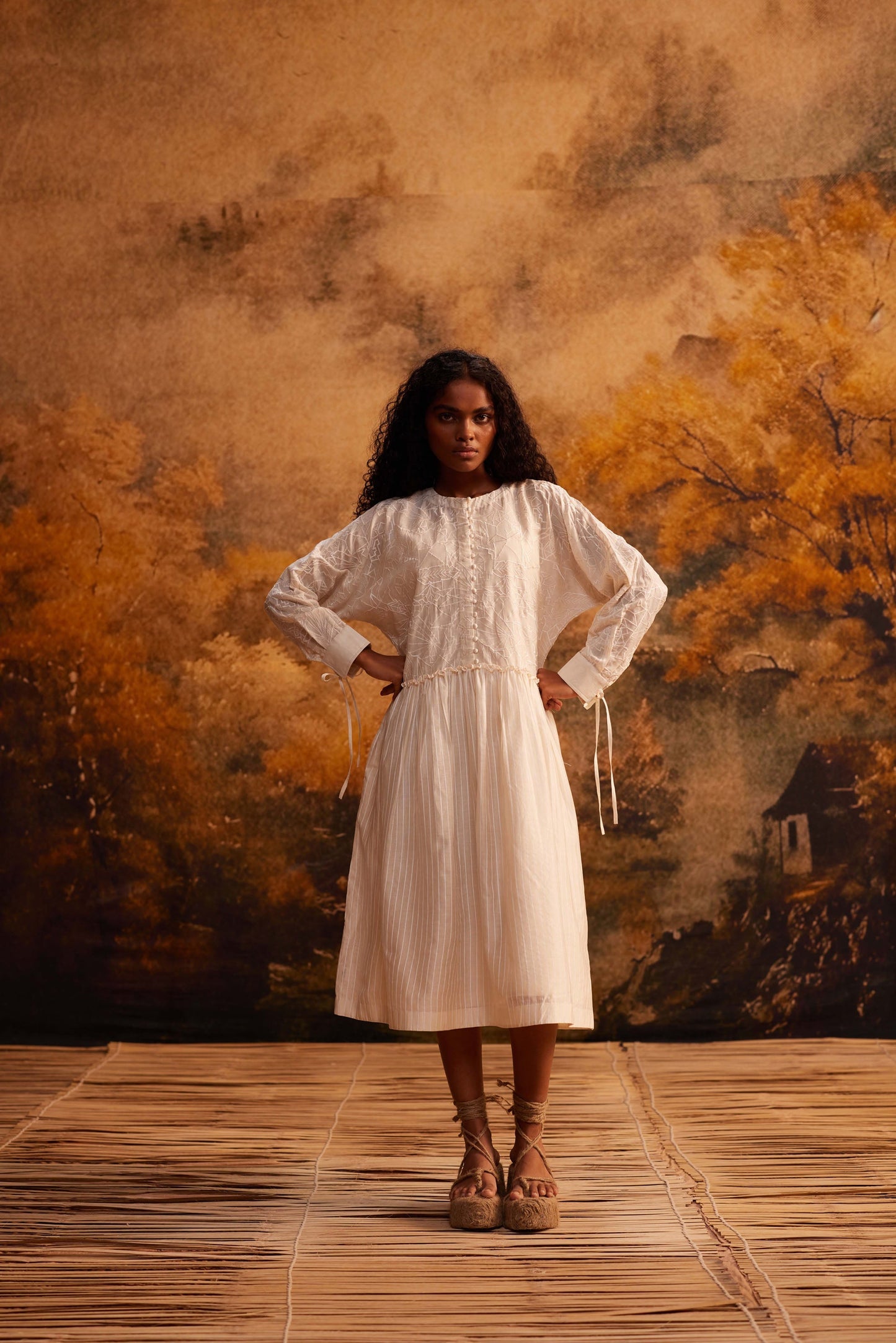 The Tobira Dolman Dress exudes a quiet elegance with its relaxed fit and artful detailing. Crafted from embroidered Chanderi, it features graceful dolman sleeves and delicate gathers at the waist, creating a soft and flowing silhouette. Paired with a coordinating slip, this versatile dress strikes the perfect balance between comfort and sophistication. Its timeless design makes it a wardrobe staple that effortlessly flatters and captivates.