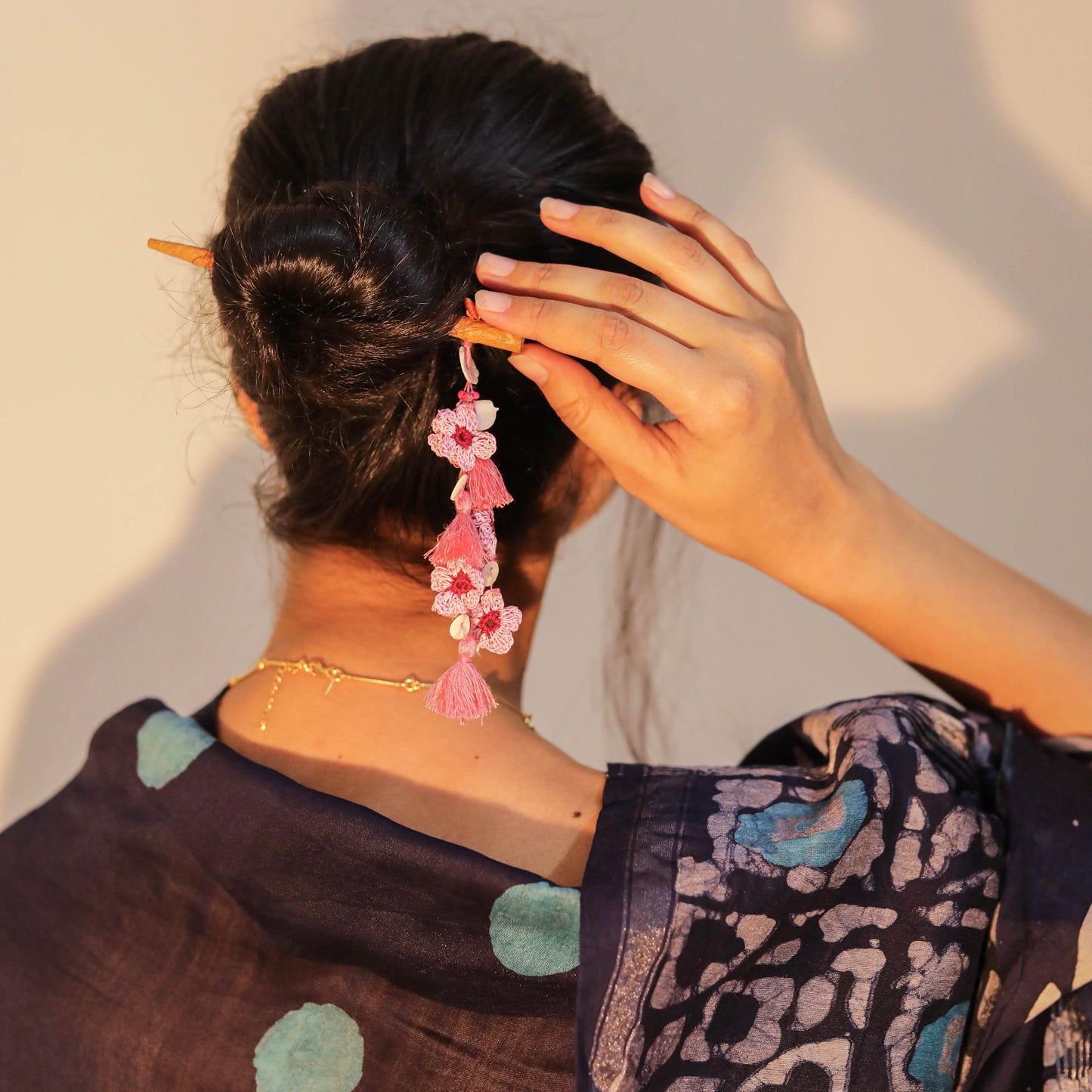 Wooden Hair Stick Pink And Off White at Kamakhyaa by Ikriit'm. This item is Accessories, Cotton Yarn, Hair Accessory, Ikriit'm, Off White, Pink, Wood